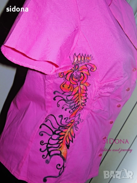 Риза с къс ръкав "Pink".Експлозия от ярко розово с ярко оранжеви нарисувани елементи.Ръчно рисувана,изработена от еластична материя.Наличен размер: М