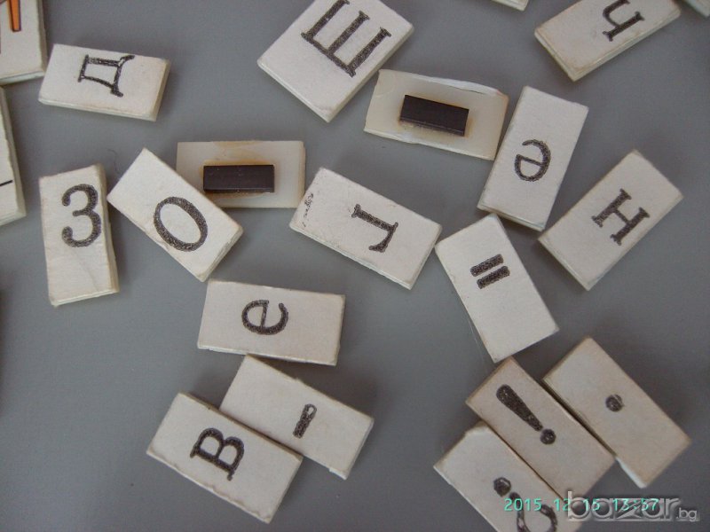 Има липсващи букви които са възстановени на картон но са без магнит и заради това цената е 8 евро.