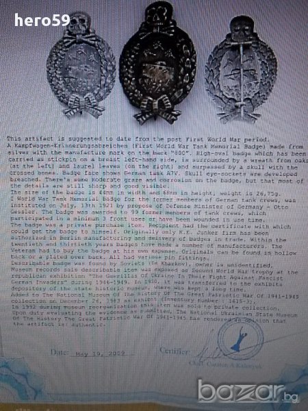 Предлагам Ви, един много рядък немски сребърен знак от първа световна война,даван на командири на танкове.Има също произведени такива знаци и от други метали,съответно и със други обозначения.До колкото ми е известно има четири или пет вида.Това от мен,а на вас оставям възможността да се любувате.