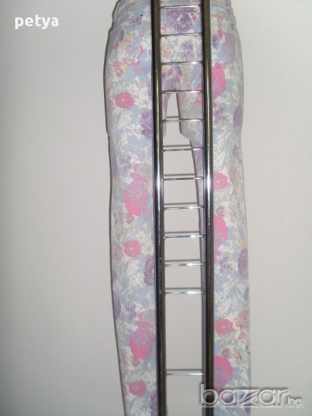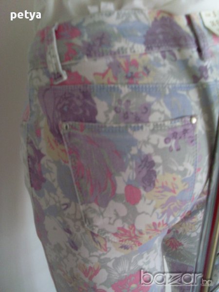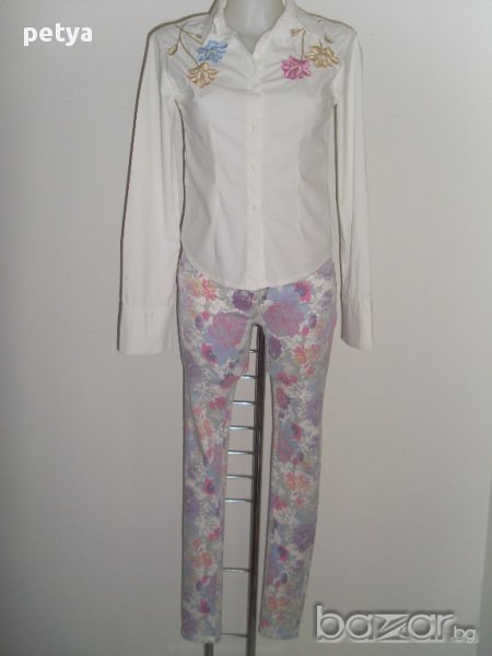 дамски тесен панталон със свеж флорален мотив;текстилна комбинация от 71.5 %памук,27%полиестер и 1,5%спандекс,плътен и много мек на допир;размери S(36) и XS(34) .