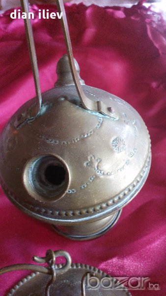 някакъв съд не знам за какво служи.може би лампа не знам.или църковни ритуали, висо4ина с шапката и със куки4ката около 30 см.в най - широката 4аст е 10 см.