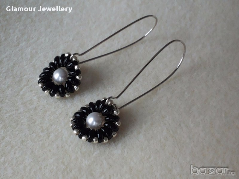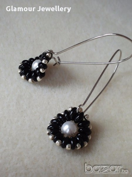 Обеците са ръчно изработени с бяла перла и мъниста.Кукичките са метални.Дължина на обеците заедно с кукичките -5,2см.,ширина на цветето от мъниста-1,5 см.