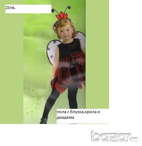 Детски костюм Калинка.Размер S /за деца от 4-6 години.Размер M /за деца от 7-9 години.Размер L /за 10-12 годишни деца.Костюмът включва:поличка,диадема*крила