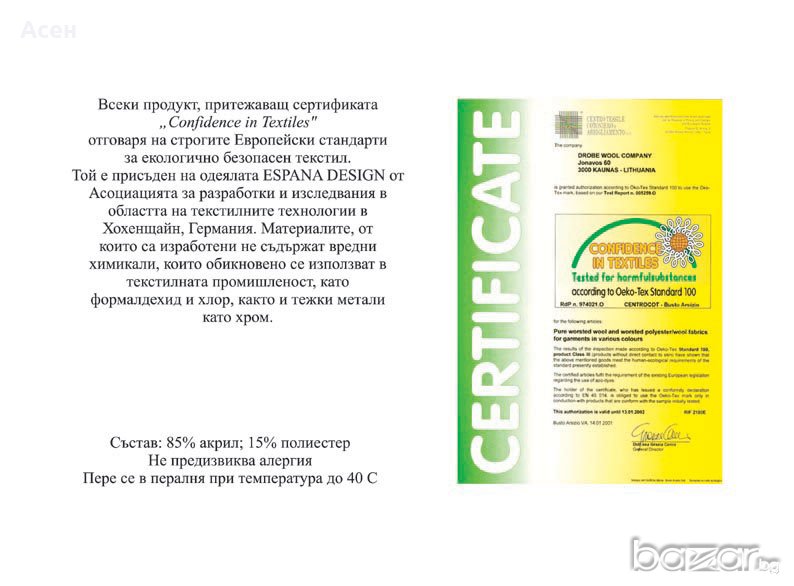 Продуктите притежава сертификат "Confidence in Textiles"nce in Textiles"