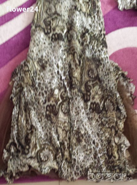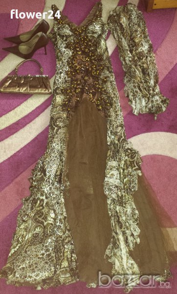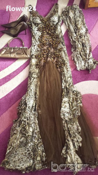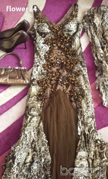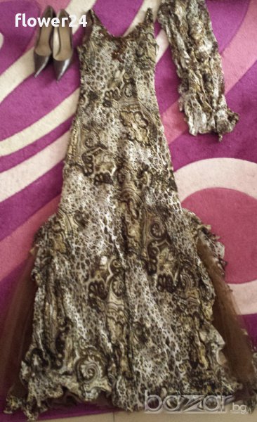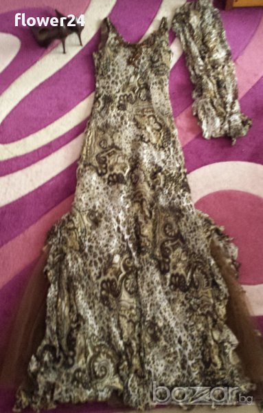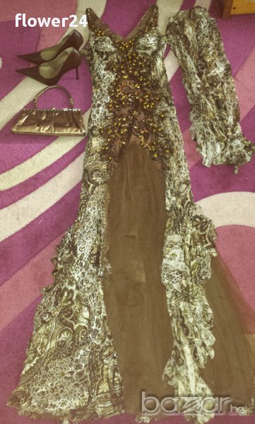 бална рокля ! Купувана е от гр. Виена,Австрия за абитуриентски бал и обличана само 1 път за няколко часа, размерът е за момичета от С до М. Няма никакви следи от употреба, като нова е ! На марката LISSA. Материята й е 30 % полиестер и 70% коприна. Страхотно качество, изработка и материя, с цип отстрани. Цветовете са много красиви и богати, отпред е пошита с камъни и мъниста, от които всичко си е на мястото, с подплата е, отпред се разкроява тъмно кафяв тюл, който дава много свобода на движенията. Роклята е удобна, пада леко и царствено. Има леки банели за гърдите, които да ги повдигат и оформят по-добре. При раменете и отзад до гърба също е пошита с камъни и мъниста. Роклята е подходяща за дами, които са високи около и над 170см., или за дами, които могат да носят високи токчета, отзад е с лек шлейф. Размери: бюст - 80-90 см, талия -60-70см., ханш-81-95см, от рамо до рамо -33 см, дължина отпред-149см, отзад-152см, Към роклята има и шал в същите цветове, който върви безплатно към нея. Към роклята има и чантичка в тъмно златист цвят, която много си отива, също купувана от Виена, с 3 цветенца с камъни от дясната й страна, не е ползвана, с 3 вътрешни джоба и един външен от задната й страна, трапецовидна форма. Размерите й са:26 на 22 см- ширина и 12 см. височина, височината на дръжката-13 см. Към роклята има и тъмно кафяви обувки -остри, с ток 11 см., отново купувани от гр. Виена, обувани един път. Номер 39 са, но стават и за 38, защото аз нося 38. Цената на роклята е 200 лева (шалът си върви към нея и е безплатен). Ако желаете роклята и чантата цената е 230 лева. Ако желаете роклята и обувките цената е 220 лева. Ако желаете роклята, обувките и чантата цената е 250 лева.