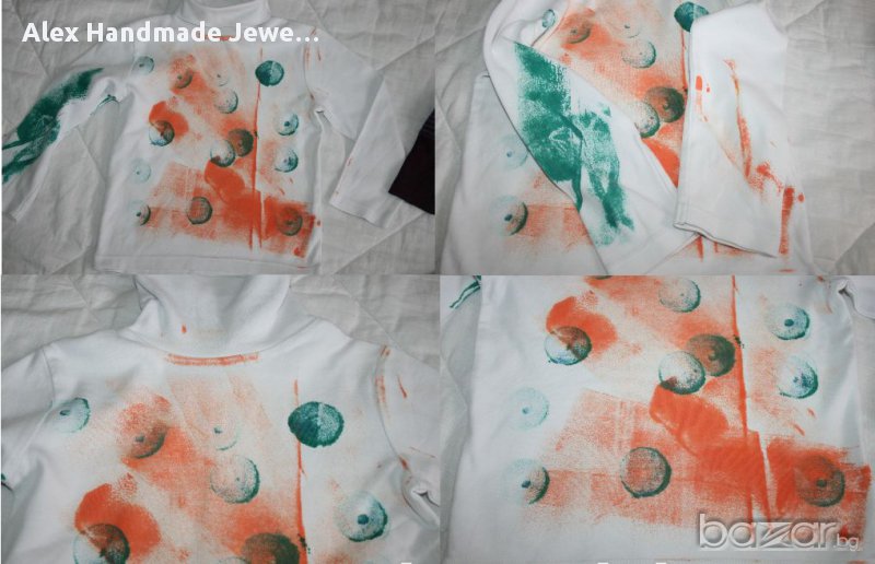 8. Цена 3 лв. Ново бяло поло H&M с щампи в зелено и оранжево. Ново, без етикет. 50% органичен памук, 50 % памук. Плътно и стегнато трико. Дължина: 40 см., Мишници: 32,5 см., Ръкав: 34/26,5 см.