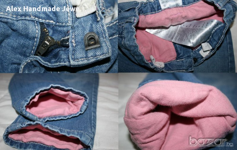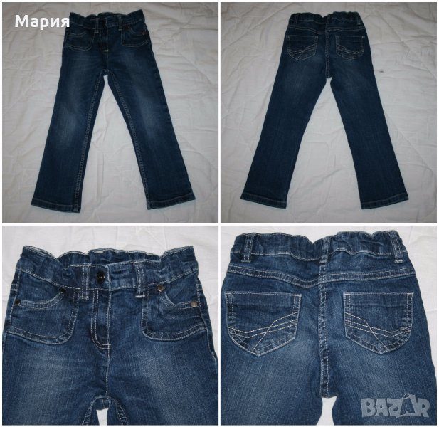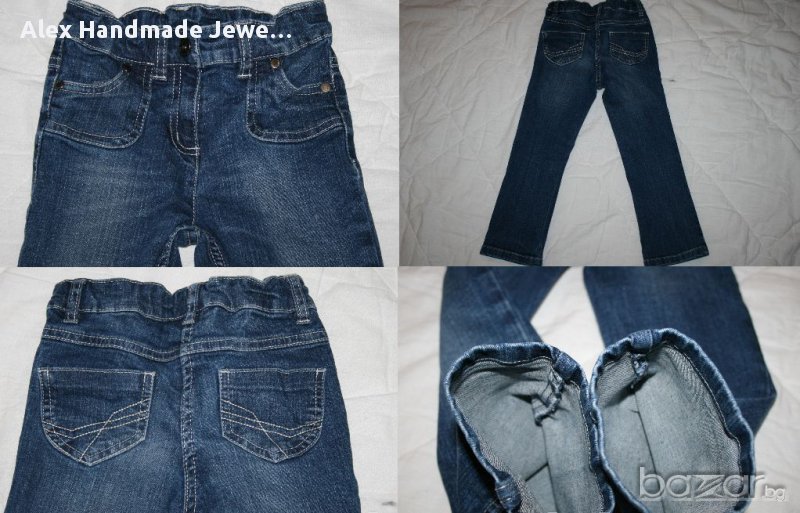 11. Цена 1 лв. Дънки с памучна подплата. 100% памук. Слим модел, без еластичност. Денимът е в отлично състояние. С нормални следи от употреба по подплатата. Забележка: Едната част на закопчалката липсва. По етикет са размер 2-4 г. /98 - 104 см. Дължина: 65,5/45,5 см.; Дълбочина: 18/26,5 см.; Колан /с ластик коректор/: максимум 30 см.; Ханш: 34 см.; Крачол при чатала/долу: 20/13 см. !Заради подплатата, ширините в ханша и на крачола са измерени от вътрешната страна на дънките, с цел максимална точност!