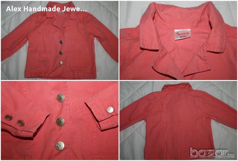 5. Цена 1 лв. Сако Impidimpi цвят корал. 100% памук. Платът е в перфектно състояние, но е със следи от употреба по ръбовете - вижда се на снимките. По етикет е размер 98-104 см. Дължина: 39 см., мишници: 37 см., ръкав: 34/27 см.