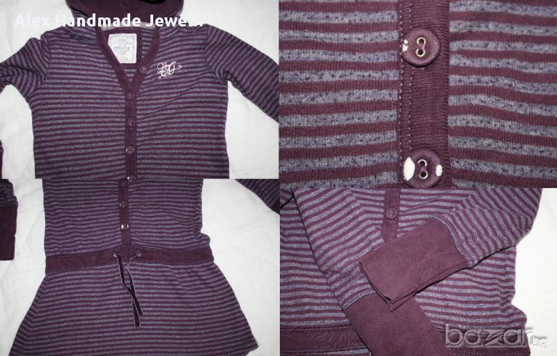 9. Цена 1 лв. Туника H&M - 2 нюанса на лилаво райе. С дълъг ръкав и качулка, с връзка за стягане в кръста. Забележка: на две от копченцата отпред платът, с който са облечени е прокъсан. 68% памук и 32% полиестер. Материята е плътна. Дължина: 54 см., Мишници: 33 см., Ръкав: 36/30 см.