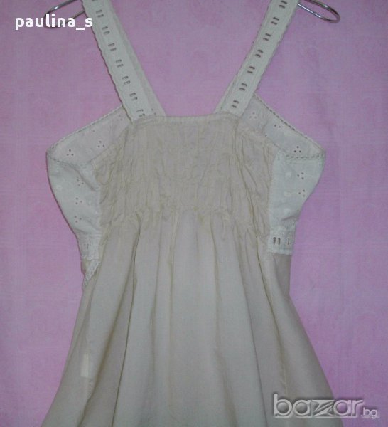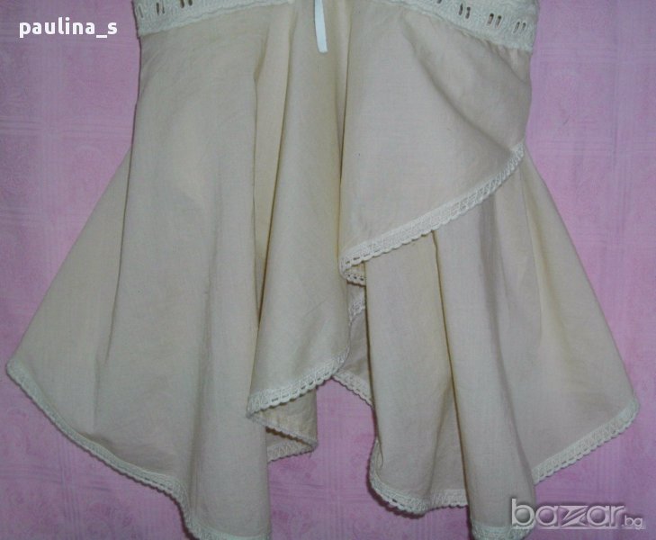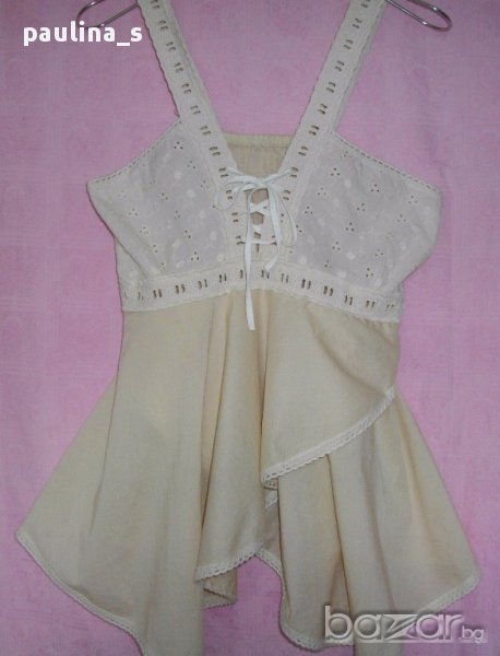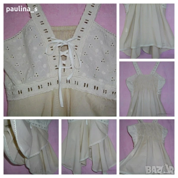 1️⃣. L / 2XL - Туника с бюстие / Италиански топ в екрю Nude. Цената е крайна 24,99лв / 12,5 евро. Моделът на бюста е бюстие, изработено от фин индийски памук с рязана английска бродерия и бродирани ленти, шнур между гърдите за коригиране на обиколката. Отзад е фиксирано с хоризонтални ластични набори. Долната част е богато надиплена от веревно скроени парчета придаващи ширина и допълнителен ефект на бюстието. Една бройка, без дефекти, ново без дефекти.