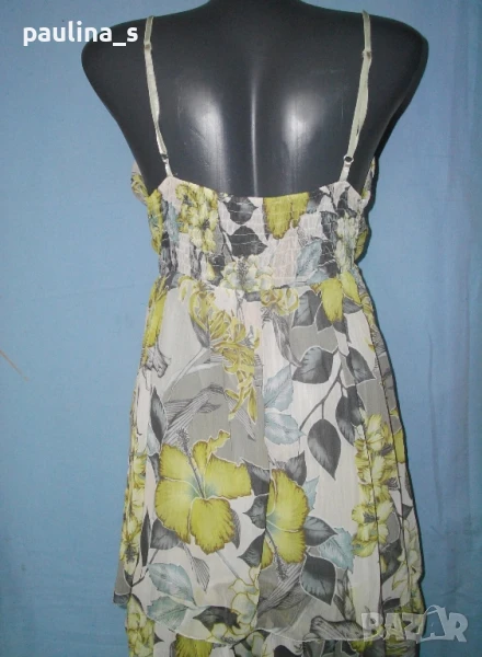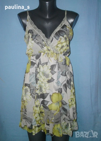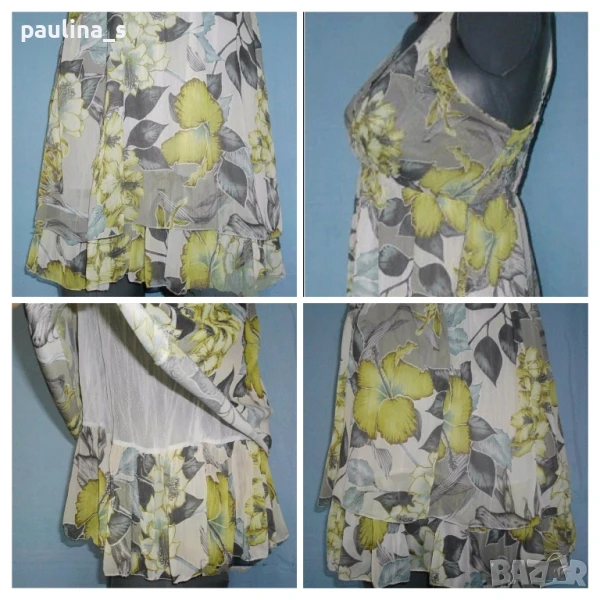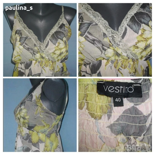 3️⃣. Колаж / Бутик / L / 3XL - Туника с бюстие в зелен флорален принт "Vestino" Italy. Цената е крайна 19,99лв / 10 евро. Дамска копринена и многопластова туника с бюстие. Платът е в "Армани стайл"- фабрично намачкан, в свежарски флорален принт. Горната част е бюстие с дантела и прихлупване. Отзад е фиксирано с хоризонтални ластични набори за прилепване към бюста. Надолу наборите започват от нивото под бюста, където също е фиксирано с ластичен набор, хастарът е еластичен, за него е прикрепен допълнителен щедър волан. Презрамките са от сатенени ластици и могат да се регулират индивидуално. Като ново е, без дефекти и етикет.