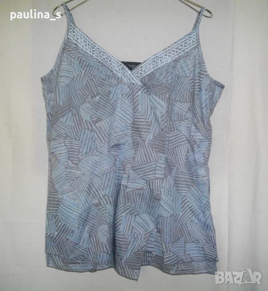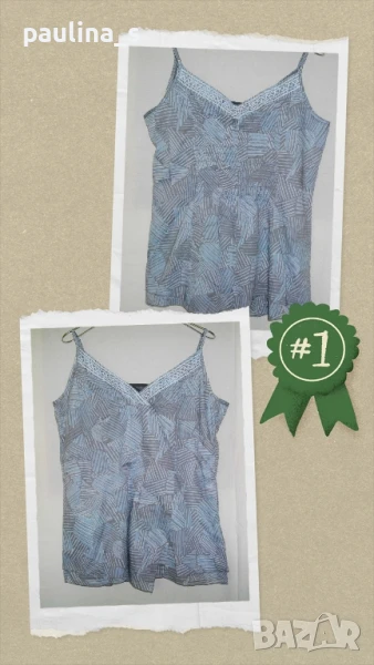 2️⃣. Колаж / L / 2XL - Дизайнерско бюстие тип туника, от фин индийски памук" sandwich_". Цената е крайна 24,99лв / 12,5 евро. Дизайнерско бюстие, от изключително фин индийски памук, в сиво синя гама. Моделът е с асиметрична кройка, долната част е разкроена и е в 2 пласта плат, като горния завършва отпред с цепка в ляво. Пластовете се разминават по дължина и завършват само на 5 конечен оверлог, поради фината материя. Закопчава се отстрани със скрит цип. Зоната на бюста е с кройка на бюстие допълнително украсено с успоредни тегели и платка с бели щампи. Ширината отзад прилепва по тялото от хоризонтално поставени ластици. Дължината на презрамките се регулира отгоре. Дрехата е дизайнерска, нова.