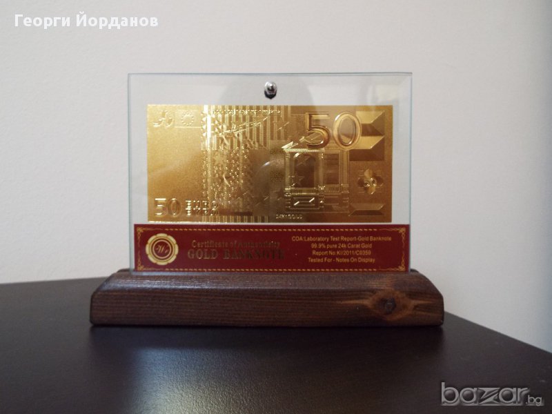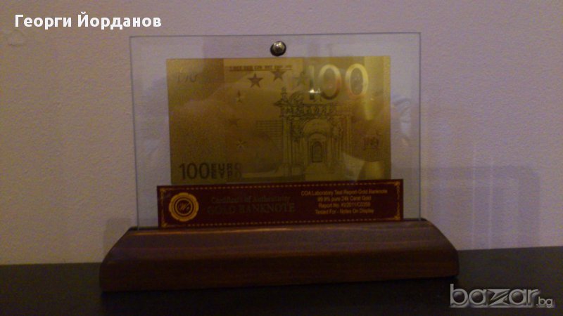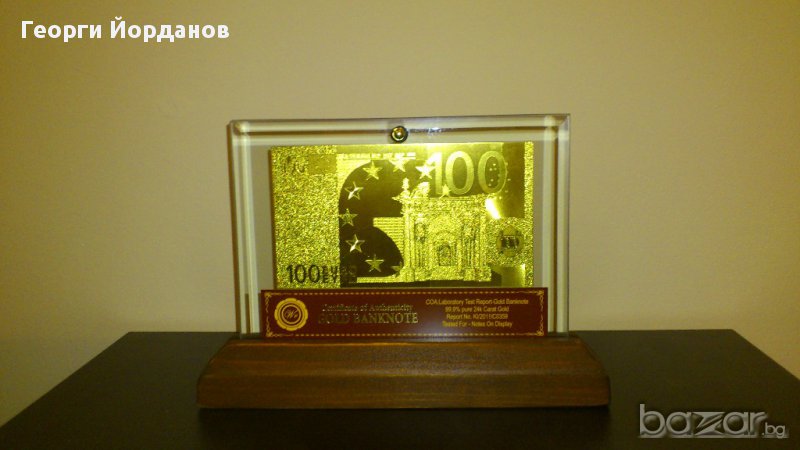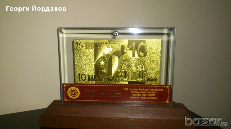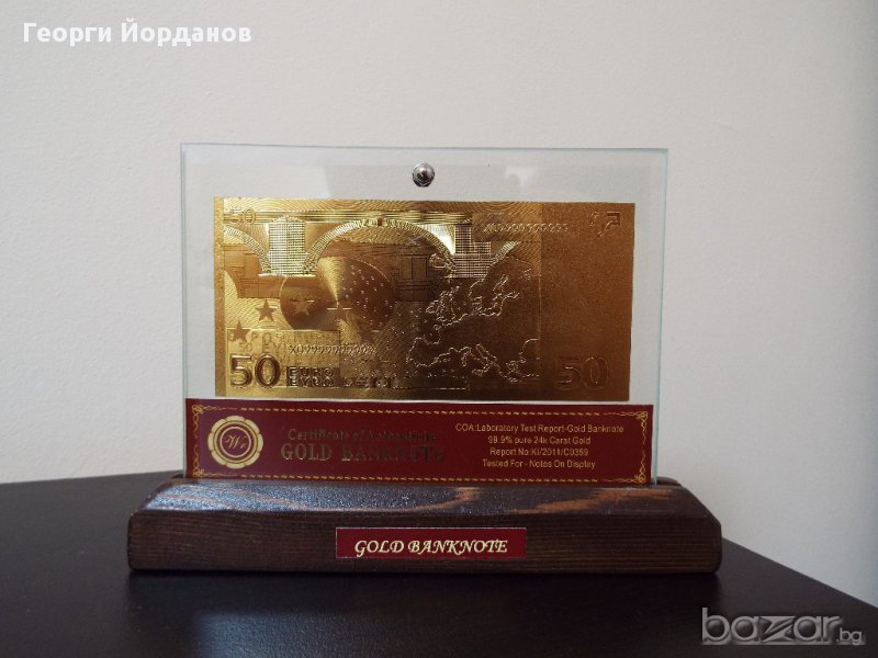 500 евро златна банкнота изработена от златно фолио с чистота 24к и горещо пресована със специален поликарбонат за здравина и устойчивост поставена в стъклена поставка идеални за подарък или сувенир