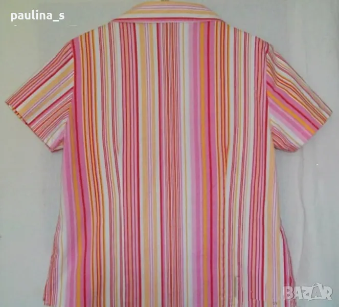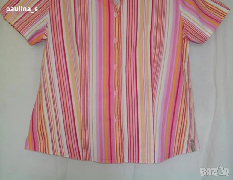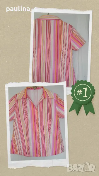 2. Колаж / L / 2XL - "Zone" by Zabaione"design. Цената е крайна 14,99лв. Дамска дизайнерска еластична риза, модел спортна Шемизета. Материята е памук и ликра еластична и покрива няколко размера. Подхожда и за офис, с дълбоко шпиц деколте, ниско закопчаване, стои сeкси. Десенът е в топлите гами, на вертикални райета, издължава фигурата. Вталяването е за сметка на модела. Копчетата са миниатюрни, брандирани, логото е поставено и в долната лява част на дрехата. Като нова, една бройка, без дефекти и етикет.