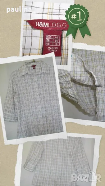 Дамска риза на L. O. G. G.by "H&M". Label Of Granded Goods e луксозната серия на бранда. Платът е памук с минатюрни ластични ленти, което го прави да изглежда като на "вафлички" има и еластичност, става и за съседните размери. Моделът е изчистен от допълнения, акцентирайки се върху релефа. Ръкавите са 7/8, копчетата седефени. Нова, без дефекти и етикет.