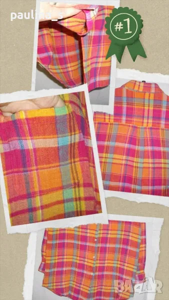 1. Колаж / M / XL - "Zeste"de mode / прет а порте. Цената е крайна 19,99лв. Дизайнерска кенарена риза в свежо каре. Моделът е леко втален с 7/8 ръкави, 100% естествен памук, прекрасно дoпълнение за дънки ако сте спортен тип дами! Копчетата са от естествен миден седеф, миниатюрни изглеждащи, че ще се счупят ако ги стиснеш!! Дрехата е дизайнерска и е много красива като десен, модел "Деним".