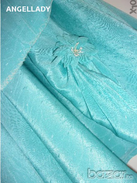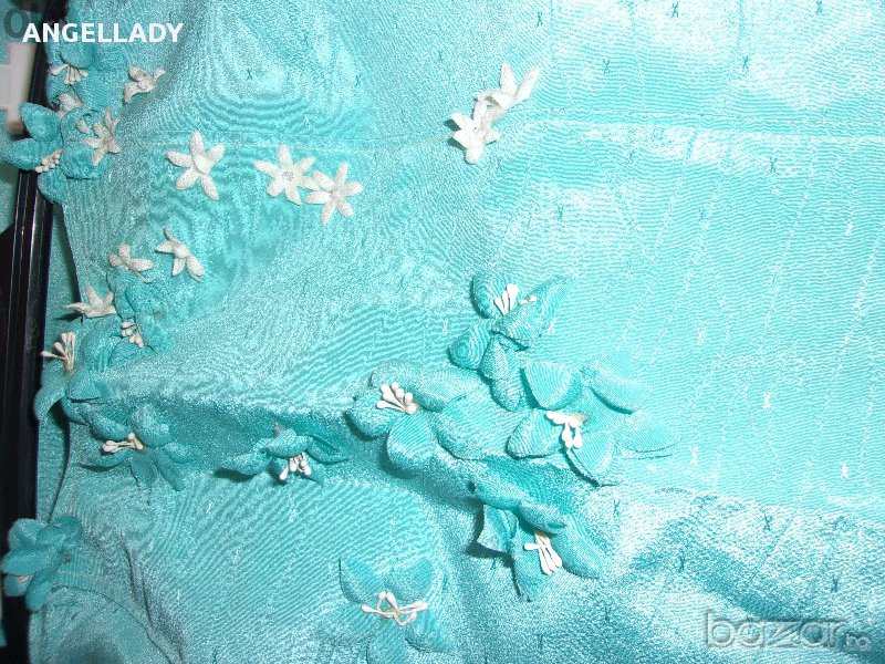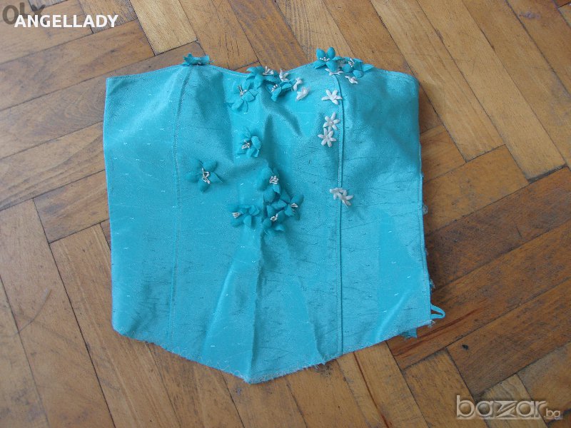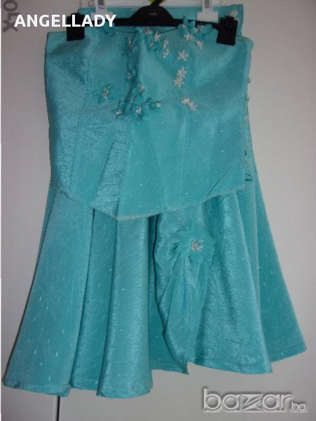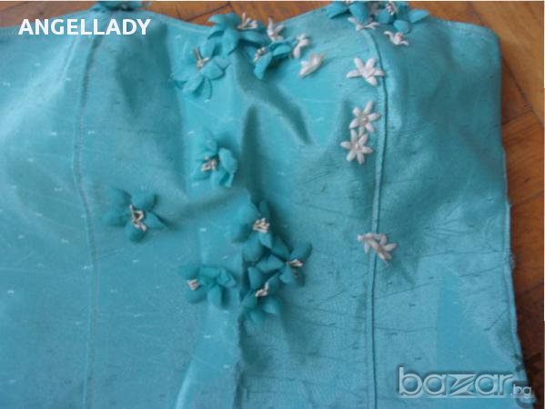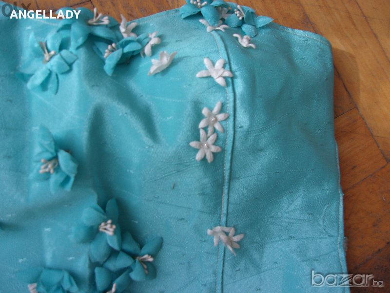 Продавам тоалет за абитуриентски бал състоящ се от бюстие което е декорирани с ръчно направени цветя и пола която в единият край е вдигната с цвете.Цвят- тюркоазОт естествена коприна