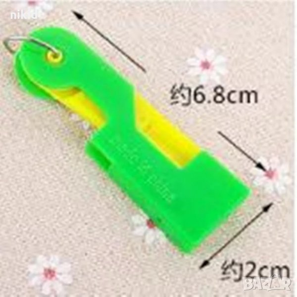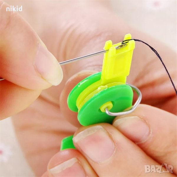 Инструкции:промушете иглата в дупката и натиснете средната част на бутонче навътре, за да се покаже кукичката,прекарайте конеца и отпуснете бутона. Извадете иглата с вдянат конец.