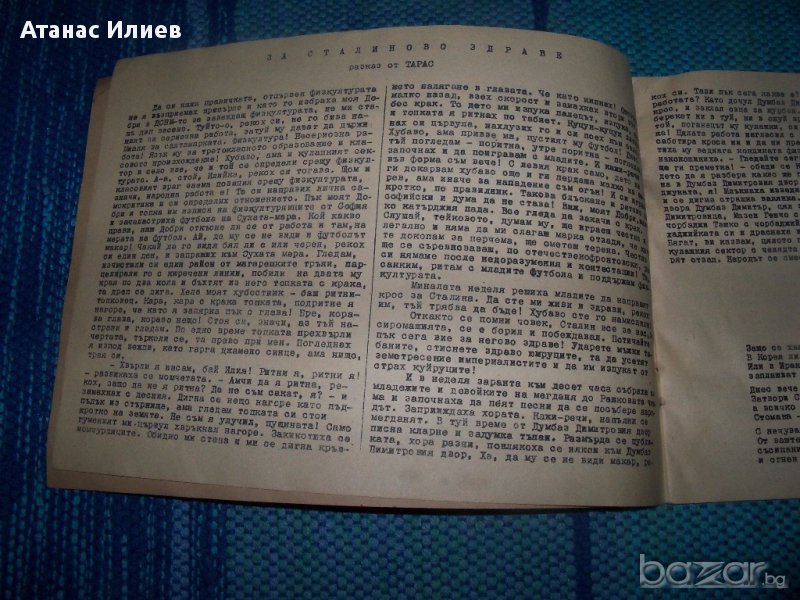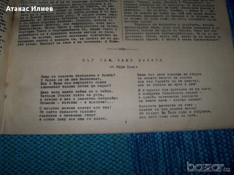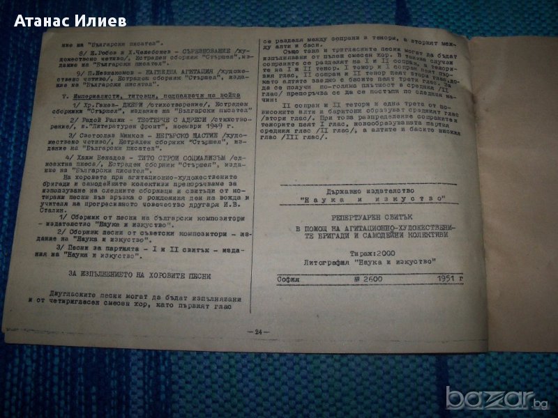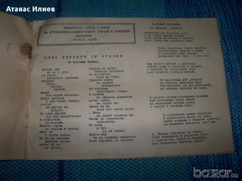 Репертуарен свитък в помощ на агитационно- художествените бригади и самодейните колективи, свитък първи, София 1951г. държавно издателство "Наука и изкуство". Свитъка е издаден в 2000 екземпляра, 24 стр. Съдържа песни, стихотворения, пиеси и разкази с пропагандна, про-съветска и сатлинска и анти-западна тематика.