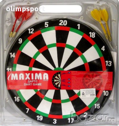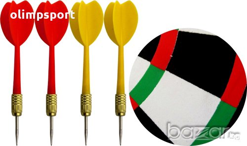 Дартс 12 инча (30.48см) с 4 стрели двустранен нов Дартс 12 инча (30.48см) с 4 стрели двустранен. Стрелите са със стоманен връх. Комплектът съдържа 4 стрели в два цвята по два броя. Дължина стрела 11см. Тегло за 1 к-кт 560г. Подходящ за начинаещи, за първите ви стъпки в дартса, както и за напреднали.