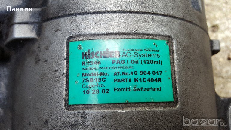 Копресор за климатик за БМВ Е39 Е46. Компресора е Швейцарски Hischier. Свален е от БМВ Е39 2,5 ТДС.