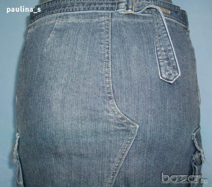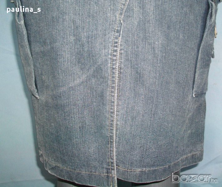 дънкова пола ексцентричен и асиметричен модел с парчетата отпред и отзад имитиращи модел на прекроени от дънки пола. Отстрани има 2 обемни джоба, а горните джобове са са косо разположени започващи от талията. Талията е висока, като е с възможност за допълнително регулиране с нанизана лента и подвижен колан с тока отзад.