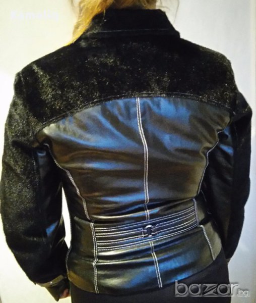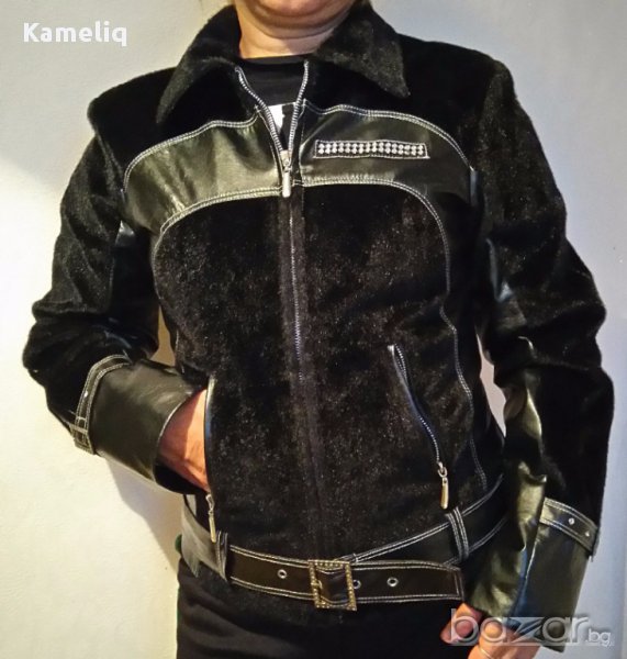 Кожено яке, съччетано с пухкав плат.Размерът на якето отговаря и на " М" и на " Л". Единствено под мишницата има лека следа от носене, което е абсолютно незабележима.Няма никакви следи от носене по яката.