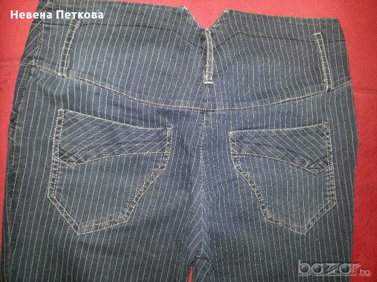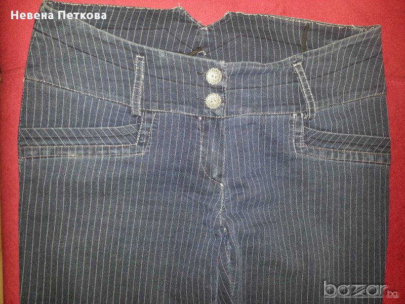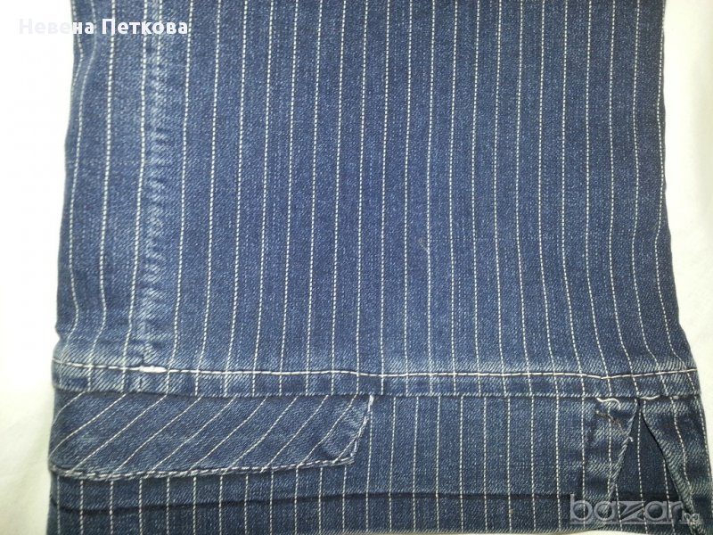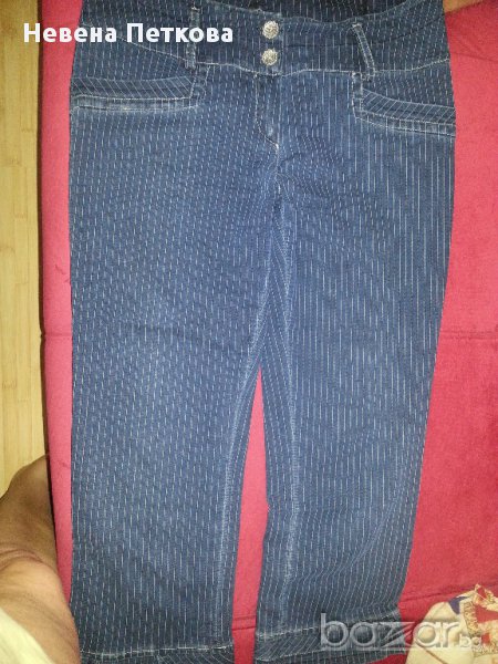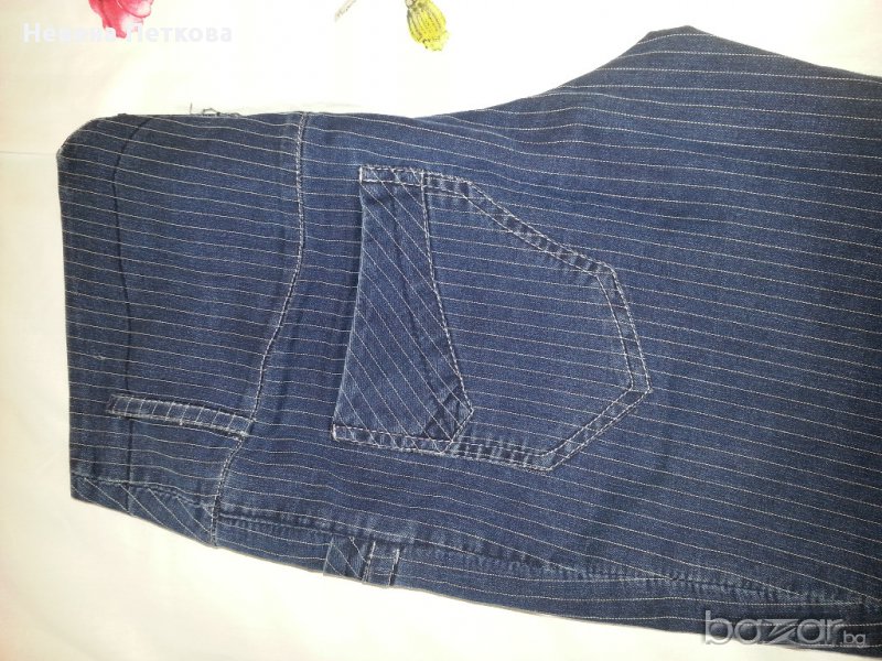 Дамски панталон летен - три четвърти, тип дънки син цвят с тънки бели райета. Памук и еластан. Размер М - № 38 европейска мярка или българска около 42-44-46. Запазен, малко употребявани. Отговарям на съобщения тук, изпращам с куриер с отстъпка, преглед и тест, или лично предаване в София.