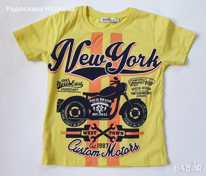 Страхотен летен комплект за момче - тениска с надпис New York и апликация на Мотор отпред и къси панталонки. Българско производство! Налични размери -92 см
