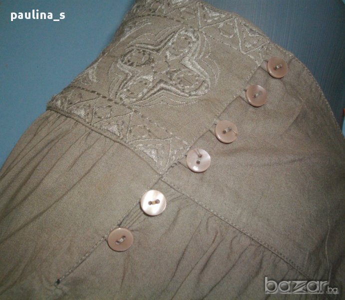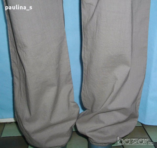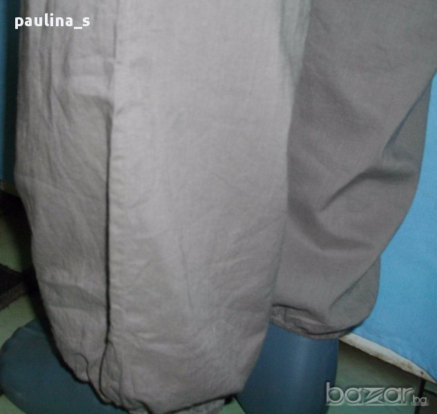 потури с със странично закопчаване. Материята е 100% много фин индийски памук, с перлени копчета. Горната част е оформена от платки, от които започва набор отпред и отзад. Предната платка е щедро бродирана със сатенирани копринени конци, а копчетата са в групи по две. Долу крачолите завършват с ластичен набор.