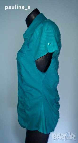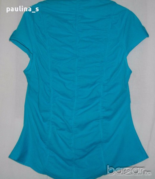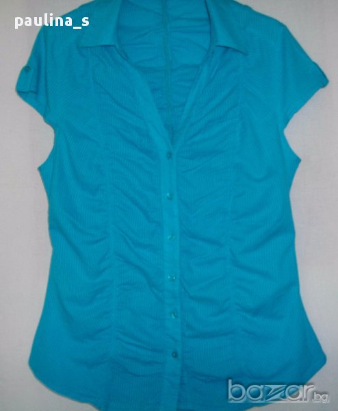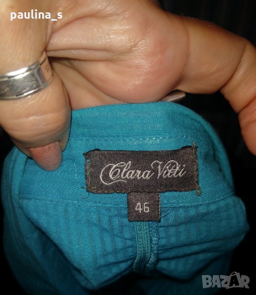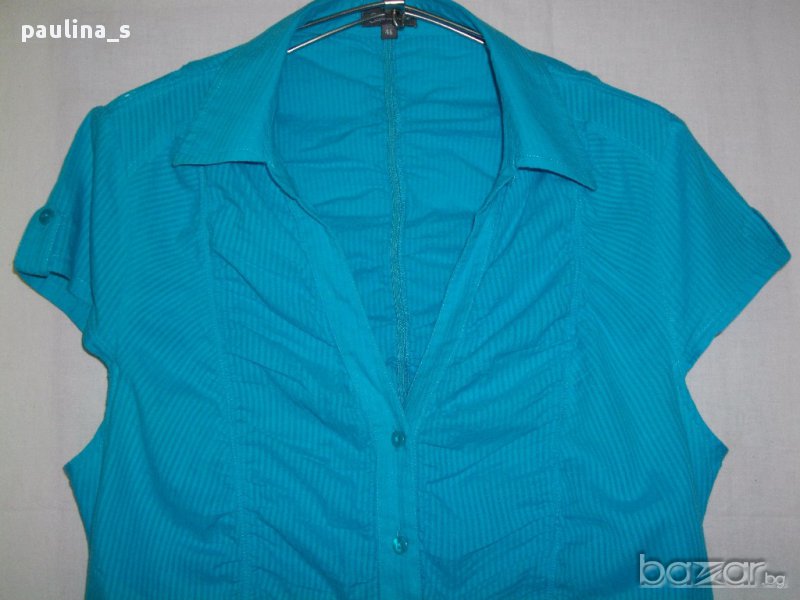 1️⃣ XL / 2XL - "Clara Vitti". Цената е крайна 34,99лв / 17,5 евро. Дамска дизайнерска секси риза в цвят тюркоаз. Материята е фин индиийски памук на дискретни вертикални райета. Моделът е втален за сметка на кройката. Цялата е обшита с вертикални ластици, деколтето е дълбоко,
