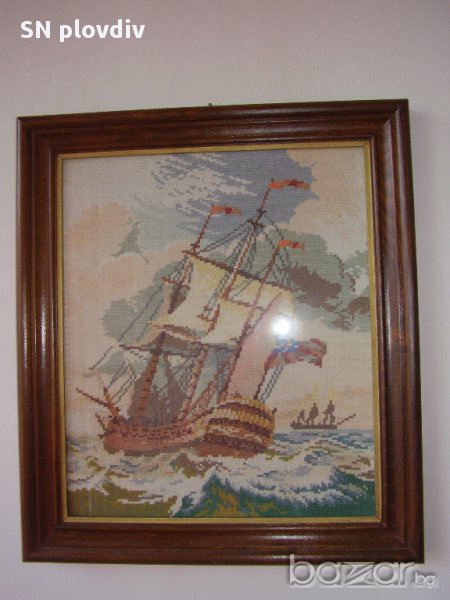 Фрегата в щурм,рамкирам със скъпа рамка. Изработен с 1:1 бод.Размери на