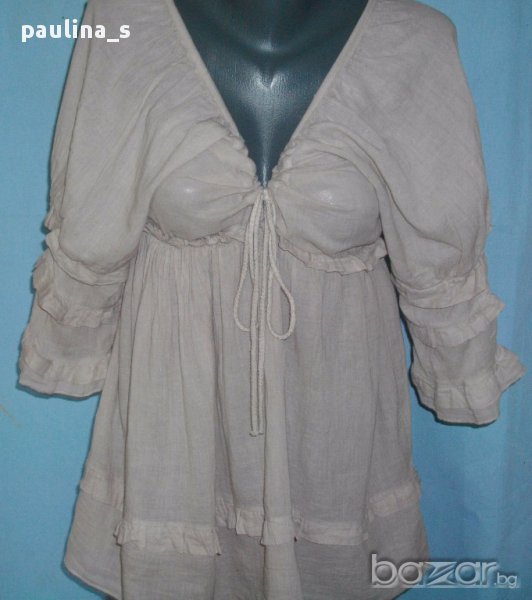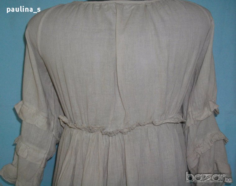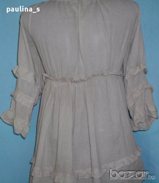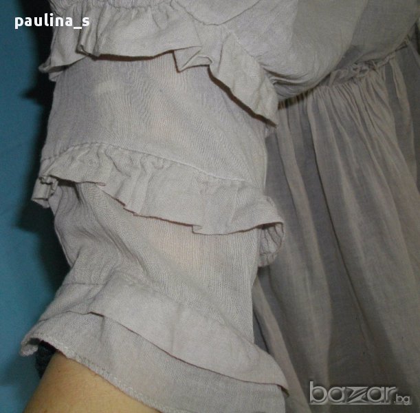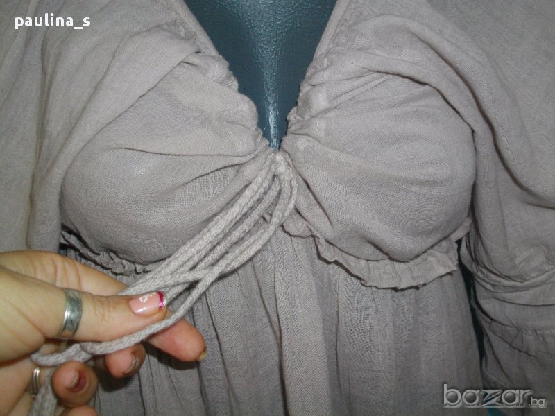 1️⃣. M / 2XL - Бутикова туника цвят Пепел от рози. Цената е крайна 29,99лв / 15 евро. Материята е много фин индийски памук, не запарва, не поти, изключително приятна за носене на голо, има прозрачност! Ширината започва от набора под бюста, има ластик и разкроение. Деколтето се регулира с шнурове, може да се носи и с открити рамене. Ръкавите са реглан 7/8 с волани. Уникална, като нова.