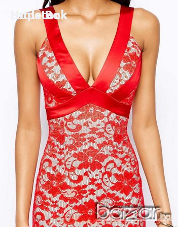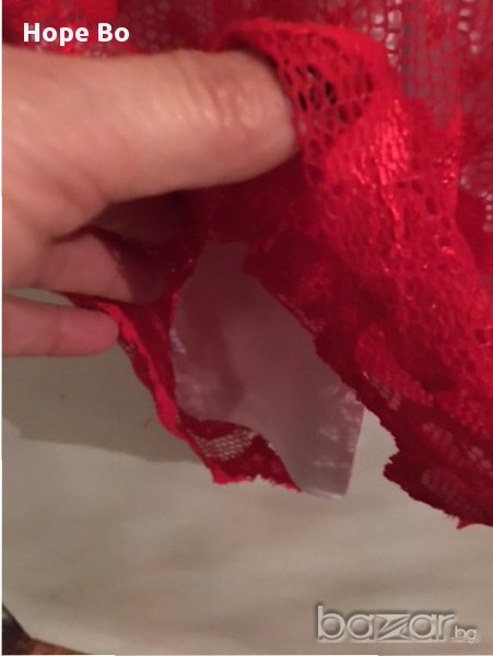 Червена дантела с панели и презрамки от червен сатен и бяла подплата. На гърба има цип.