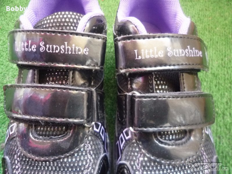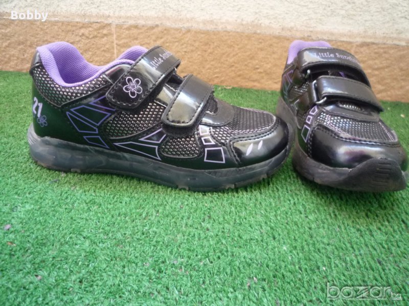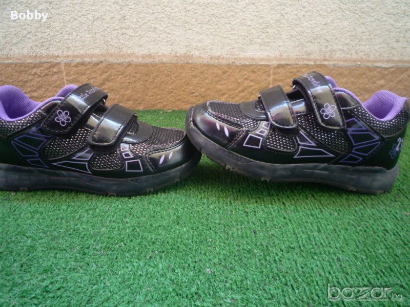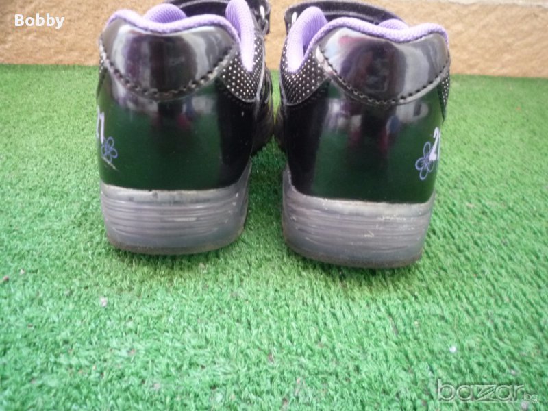 Светещи лачени маратонки 28 номер в отлично състояние. Обувани един път. Подметките им светят при стъпване. Лачени с нежни лилави цветенца. Имат по едно съвсем слабо забележимо забелване на нослетата от спъване. Снимала съм го.