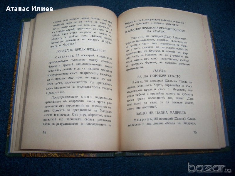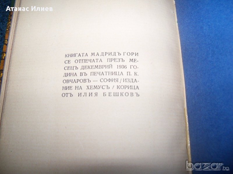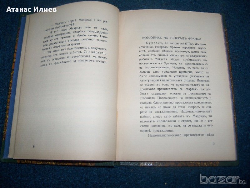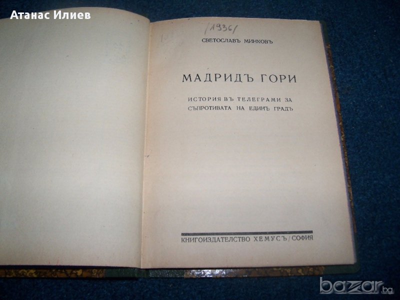 "Мадрид гори - история в телеграми за съпротивата на един град" от Светослав Минков. Книгата е първо издание 1936г. на издателство "Хемус" София, 101 стр.. Книгата е подвързана с твърди корици и е в отлично състояние, като нова, но е подвързана без оригиналните меки корици
