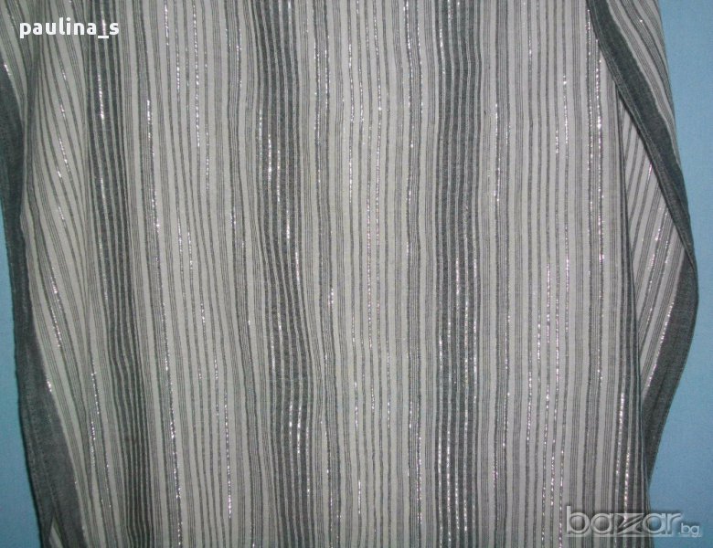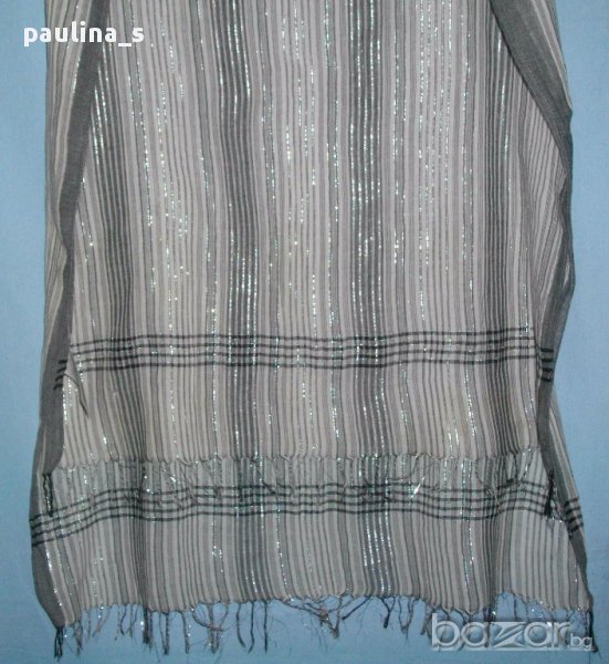 Дамски брандов шал в сиво-бяло райе с нишки от ламе. Материята е 100% много фин индииски памук.