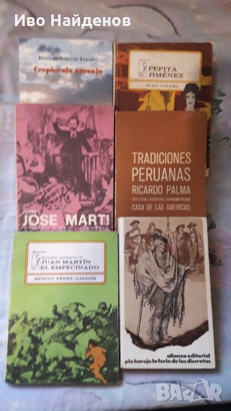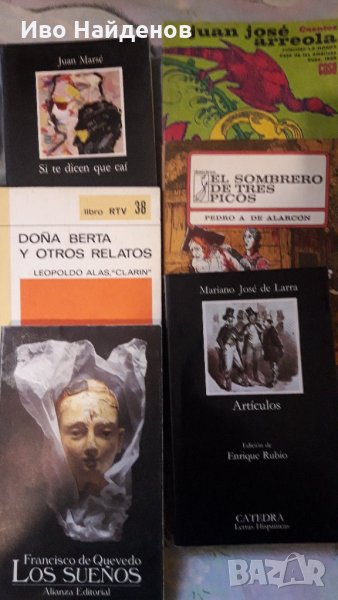 Оригинални книги на испански и латиноамерикански писатели, всяка една по 10 лв.Andrés Bello y Rufino J. Cuervo, Gramática de la lengua castellanaMiguel de Cervantes: Rinconete y CortadilloJuan Bosch: Cuentos escritos en el exilioBenito Pérez Galdós: El 19 de marzo y el 2 de mayo, Juan Martín el Empecinado, Gerona, Francisco de Quevedo: Los sueñosLeopoldo Alas Clarín: Doña Berta y otros relatosMariano José de Larra: ArtículosEduardo Mendoza: El año del diluvioJuan Marsé: Ronda del Guinaró, Si te dicen que caíPedro A. de Alarcón: El sombrero de tres picosEulogio Soriano Lázaro: Crepúsculo naranjaJuan Valera: Pepita JiménezPío Baroja, La feria de los discreteosJuan José Arreola, CuentosRicardo Palma, Tradiciones peruanasJosé Mármol, AmaliaJosé Martí, Antología mínima, Tomo I