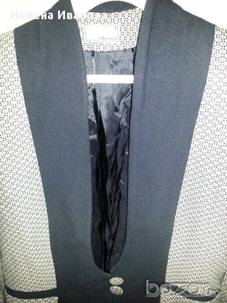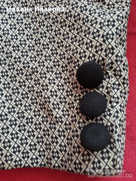 Дамски костюм с подплата, сакото е в два цвята черно и шарено от слонова кост с черно, а полата е черна. Отпред закопчаването е по-долу и е подходящо за блуза с жабо, риза, поло или др. Може да се продава и поотделно - сакото 20 лв. и полата 7 лв. Българска номерация около № 42-44 до 46 /според фигурата/. Ако желаете точни размери напишете ми съобщение, отговарям на съобщения тук или т. 0887780808, изпращам с куриер или лично предаване в София.