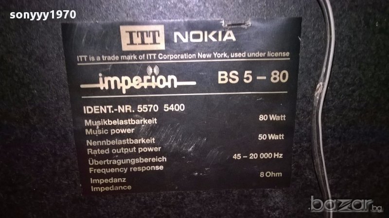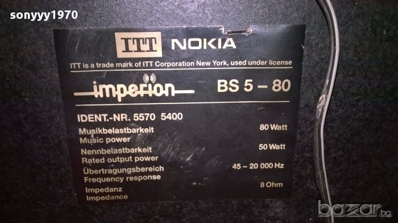 Itt-nokia-imperion bs5-80/2х8ohms/2х80watt-78/25/24см-внос швеицария...марка от класа...внесени вчера от швеицария...без ремонти и всичко е оригинално...свирят превъзходнно-от днес 28.02.22г пращаме със спиди или еконт с преглед и тест след превод на капаро за куриерската услуга поради зачестили некоректни потребители-поръчки само в тук в саита! по телефона и със смс не! краини цени! бартери не правиме! всеки ден нови неща-още над 18000 обяви тук
