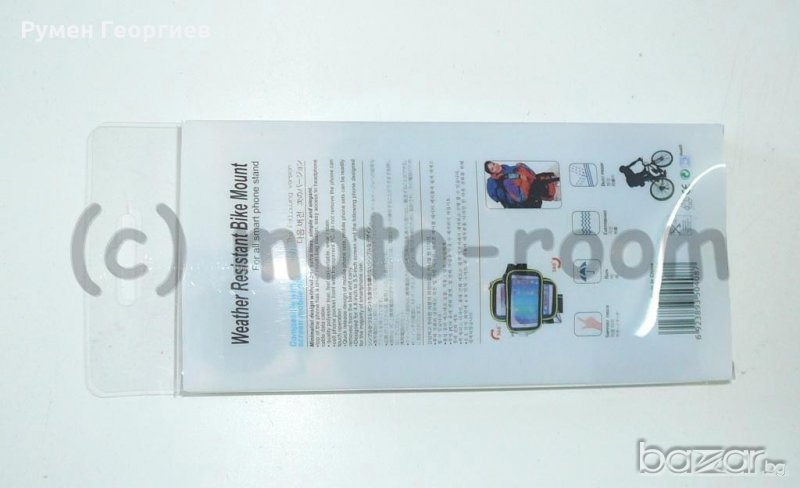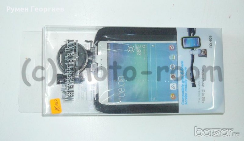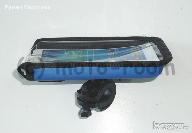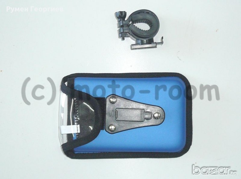 Снимки 6 - 12: Твърд водоустойчив калъф със закрепване към кормилото чрез скоба, без инструменти. За телефони и фаблети с размер на дисплея до 6". Може да се настройва на различен ъгъл спрямо кормилото. Управление през защитното фолио, без изваждане от калъфа. Цена - 18 лв.