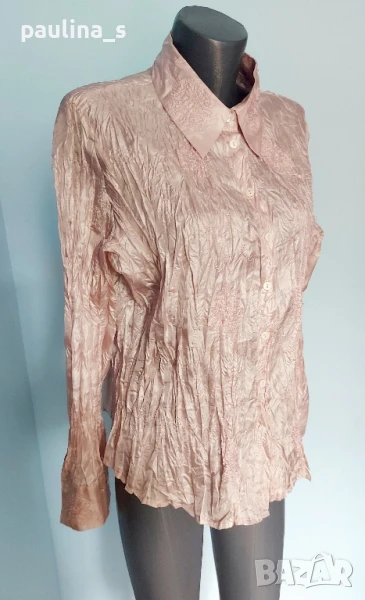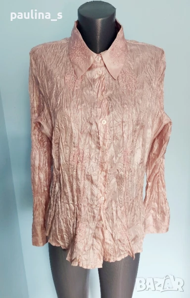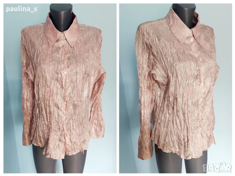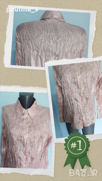 3️⃣. Колаж / XL / 3XL - "Jessica" by C&A. Цената е крайна 29,99лв / 15 евро. Изумително красива риза от сатен в "Армани" стайл - фабрично измачкана. Материята е ефирна, измачкания ефект дава транслуцентен ефекти в цвета, мени се на светлината и в ъгъла на преди позиция. Предната част, яката и маншетите са декорирани с бродерии и мъниста. Дрехата е като магнит за погледа, нежна, изтънчена и много романтична. Моделът е леко втален. Като нова.