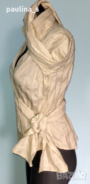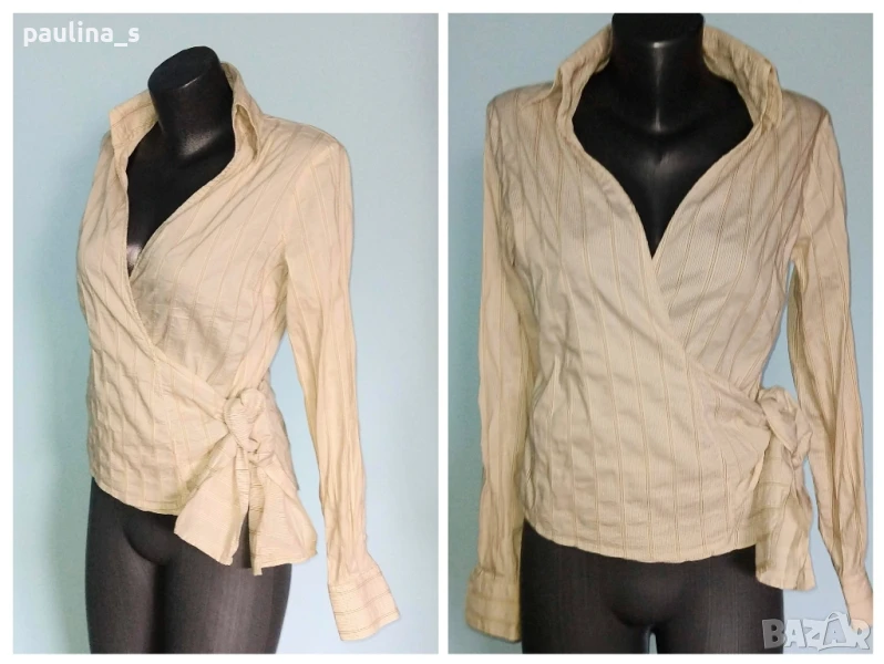 1️⃣ . L / 3XL - "Zara". Цената е крайна 29,99лв / 15 евро. Еластична риза с прекръстосано завързване отстрани. Материята е коприна с ликра, седяща релефно и вертикално набрана. Моделът е много специален с пронизана широка лента в отвор в страничния тегел, която обхваща талията и завързва отпред на противоположната страна. Невероятно секси дреха с голяма еластичност. Не запарва, не поти, може да се носи от повече от няколко размера. Яката е с високо столче и стои актуално шик! Качеството на изработката е гарантирано от бранда!! Без дефекти и етикет, като нова.