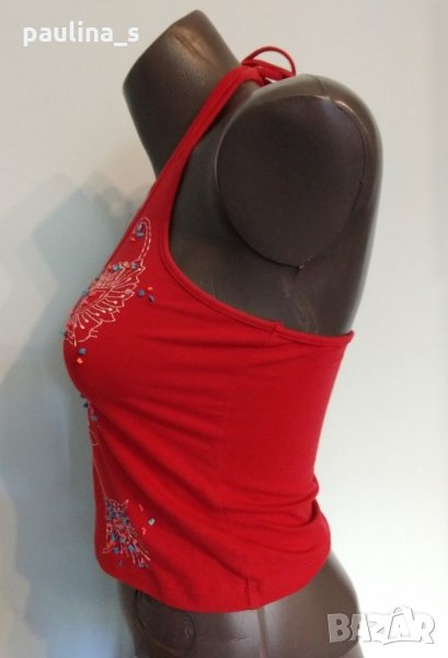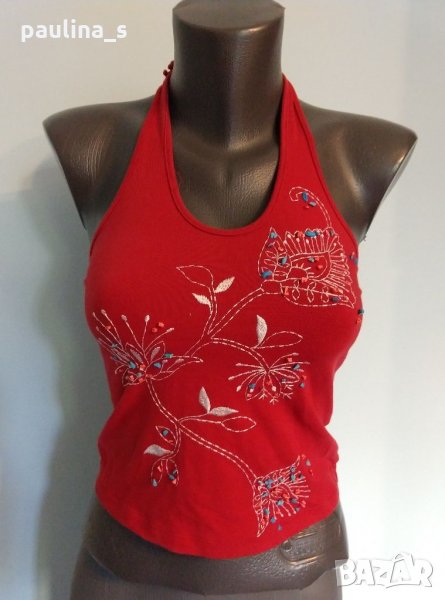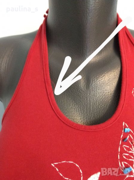 1️⃣. S / XL - Дамски еластичен памучен потник с красиви бродерии и декорации от естествени камъни тюркоаз. Цената е крайна 9,99лв / 5 евро. Завързването е през врата, материята е памук с ликра, хипоалергична и разкошна за допир до кожата. Ярко червен, има лека забележка - пропуснати бодове(снимана), което се оправя лесно на ръка, съобразена цена 9,99лв.