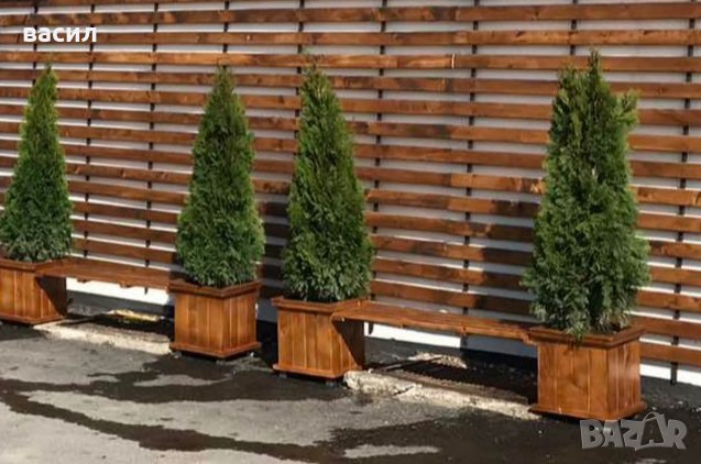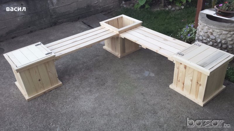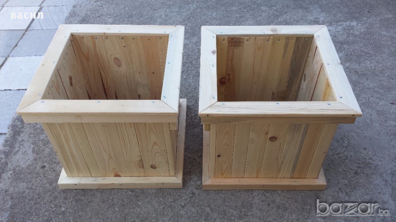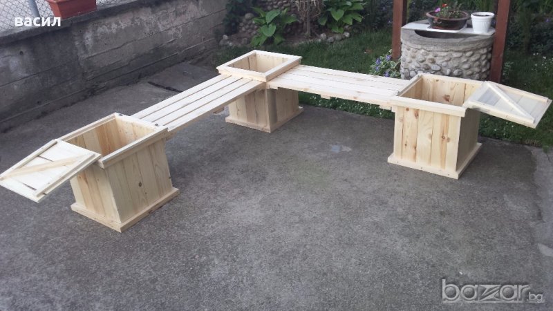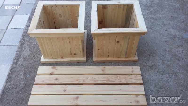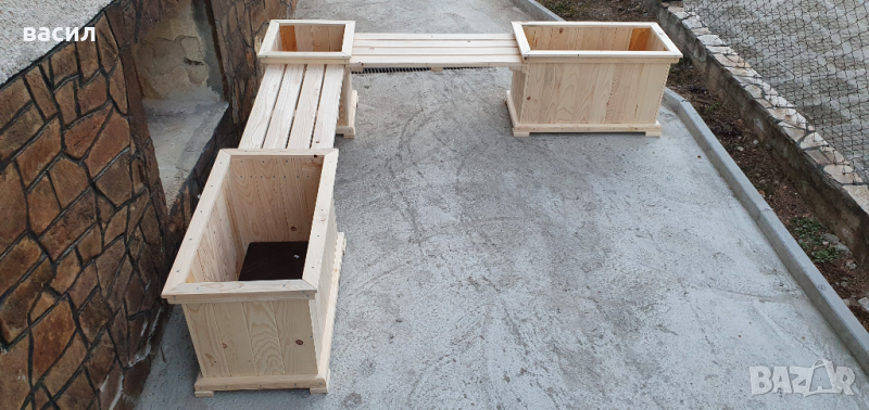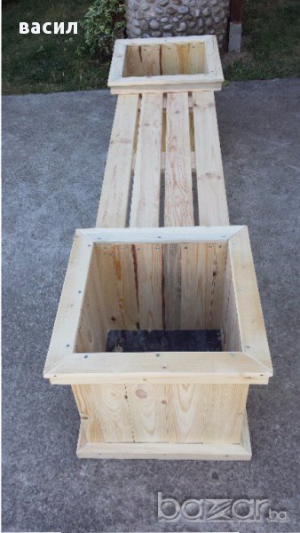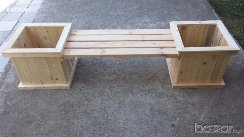 Продавам градински дървени кашпи свързани с пейка между тях. Кашпите са с размери 45/45 см и високи около 45 см. Двете кашпи са свързани с пейка между тях която само се пъха на определеното за това място и е готова за ползване. Общата дължина с пейката е около 1.70 см см.Направени от масивен чамов материал. Цената е 150 лв за комплект.Продават се не лакирани,допълнително заплащане при интерес за лакиране,според избора ви на лак.Възможно е да се комбинират няколко кашпи, като на последната снимка например, две са с капак като шкаф, може и др.комбинации, като цената е различна за всички. Всички кашпи се продават не боядисани.