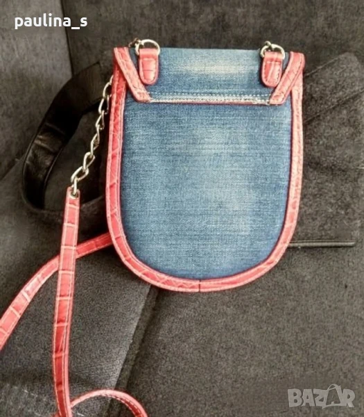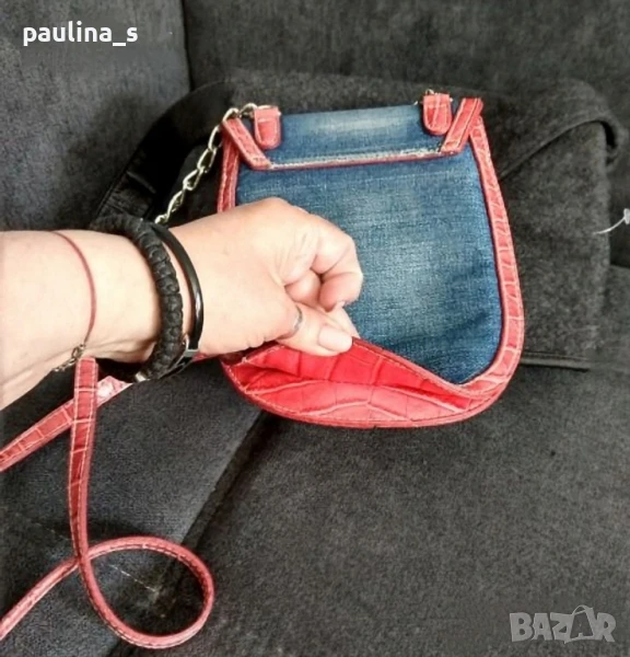 Дънкова чанта с избелващ ефект "Torrens". Цената е крайна 19,99лв / 9,9 евро. Има дълга дръжка и червена кожена част в кроко принт, едно отделение, с магнитно закопчаване - 16см / 21см/ дръжка / 132см.