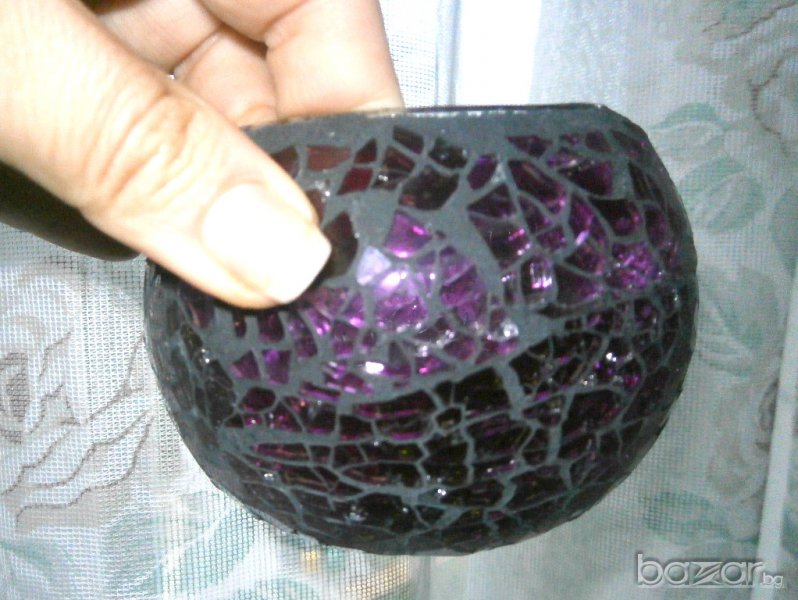 Свещник от начупено стъкло. Чисто нов. Когато свещта се постави в него стъкълцата пречупват светлината идваща от вътрещността на свещника.Подходящ е за подарък.