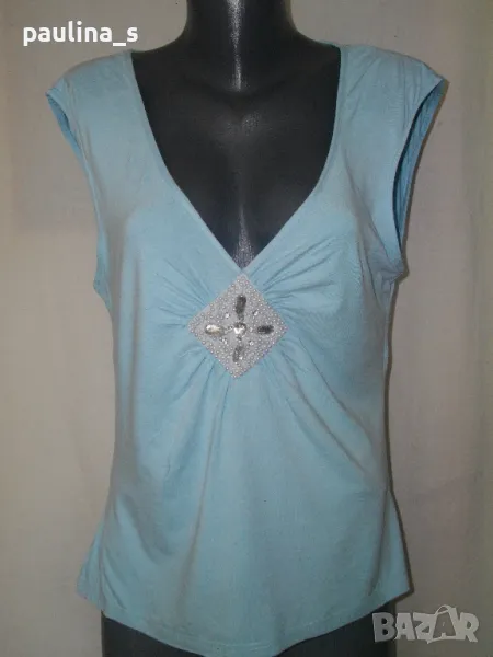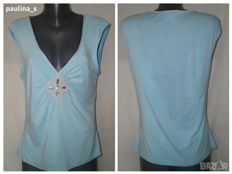 5. Колаж / L / 3XL - Синя "H&M". Блуза тип туника без ръкави, с декорации от камъни и перли. Материята е вискоза, много фина и еластична, покрива няколко размера, по етикет е М, но е уголемена. Без дефекти, една бройка е.