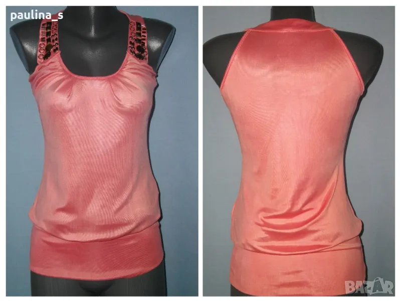 2. Колаж / S / XL - Цвят праскова "Tally Weil". Цената е крайна 19,99лв. Блуза без ръкави, тип туника, с декориращи елементи на презрамките. Материята е плътна и стегната ликра, доста еластична и покрива няколко размера. Без дефекти и етикет, като нова, една бройка.