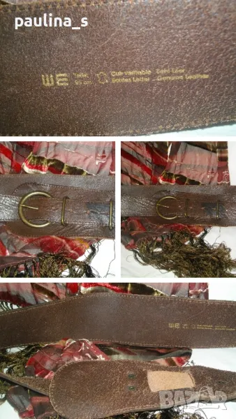 1️⃣. Колаж / L / 2XL / Естествена кожа / Винтидж "WE". Цената е крайна 49,99лв / 25 евро. Декориращ Брандов колан за талия или ханш от много дебела и здрава естествена кожа, аутлет 2000г. Коланът е за декорация и е с различна ширина, и с припокриване. Токата е оксидирана. Дължина от токата до първата дупка 90см, до последната 103см, ширина 4см/9см.